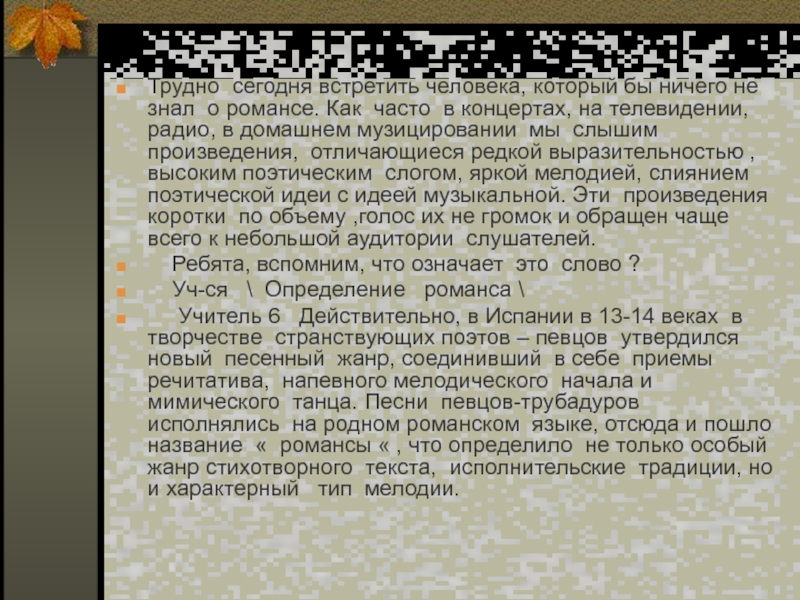 Учитель 6  Действительно, в Испании в 13-14 веках в творчестве странствующих поэтов – певцов утвердился новый песенный жанр, соединивший в себе приемы речитатива, напевного мелодического начала и мимического танца. Песни певцов-трубадуров исполнялись на родном романском языке, отсюда и пошло название « романсы « , что определило не только особый жанр стихотворного текста, исполнительские традиции, но и характерный  тип мелодии.