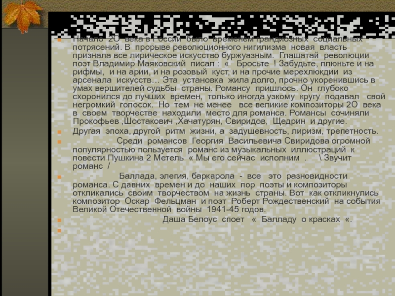 жизни России. Духовная энергетика двух великих гениев России Пушкина и Глинки породила целое созвездие художников ,которые навсегда остануться нашей национальной гордостью. В Литературе это прежде всего Толстой ,Достоевский ,Чехов ,Купри н ,Бунин и другие. В музыке традиции Глинки продолжали Мусоргский,Р-Корсаков ,Бородин ,Чайковский ,Рахманинов. Подобного явления, когда в короткий исторический период появилась бы такое количество гениев история России  не знала и, наверное, не узнает никогда. Основоположник русской классической музыки М.И. Глинка сочинил более 8О романсов, причем многие из них являются романсами-песнями.