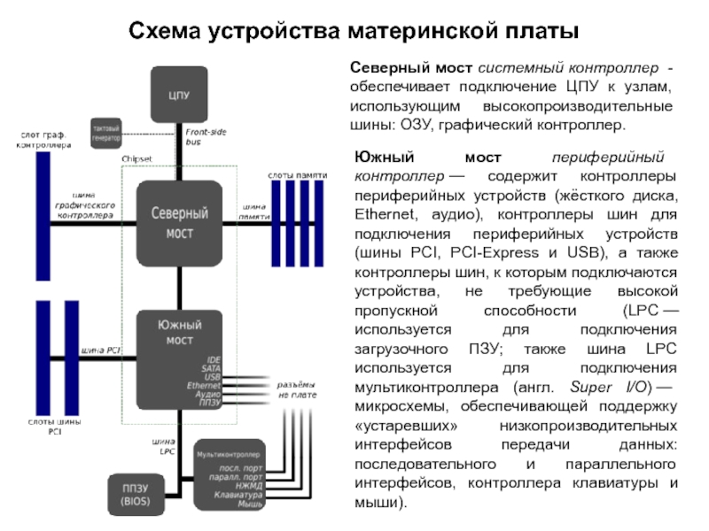 Южный мост периферийный контроллер — содержит контроллеры периферийных устройств (жёсткого диска, Ethernet, аудио), контроллеры шин для подключения периферийных устройств (шины PCI, PCI-Express и USB), а также контроллеры шин, к которым подключаются устройства, не требующие высокой пропускной способности (LPC — используется для подключения загрузочного ПЗУ; также шина LPC используется для подключения мультиконтроллера (англ. Super I/O) — микросхемы, обеспечивающей поддержку «устаревших» низкопроизводительных интерфейсов передачи данных: последовательного и параллельного интерфейсов, контроллера клавиатуры и мыши).