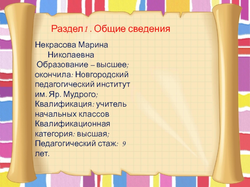 – высшее; окончила: Новгородский педагогический институт им. Яр. Мудрого;