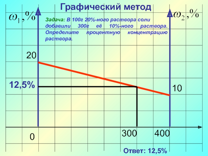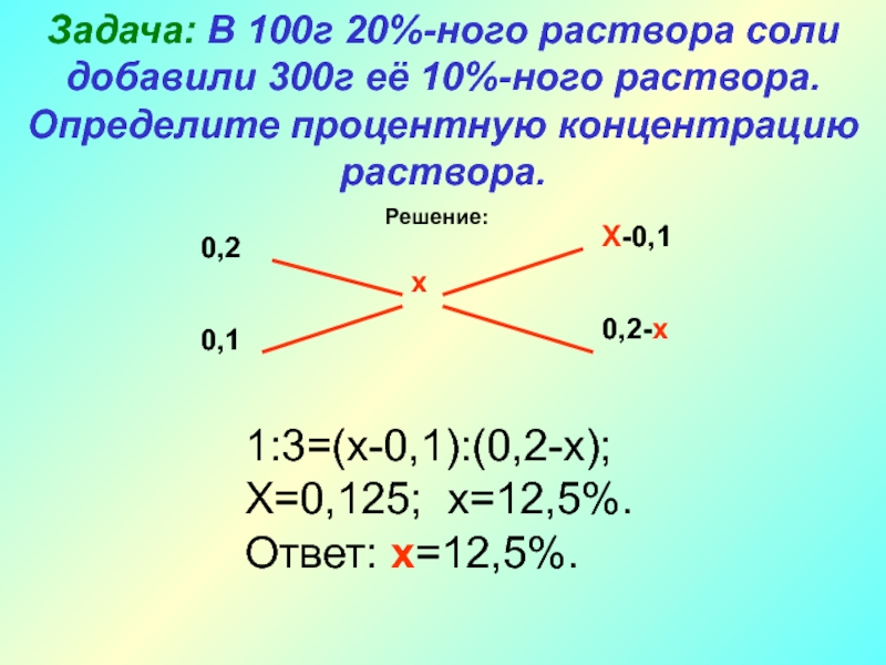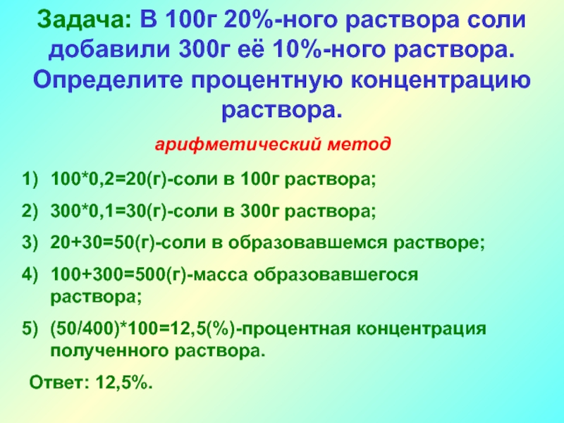 Задача: В 100г 20%-ного раствора соли добавили 300г её 10%-ного раствора. Определите процентную концентрацию раствора.