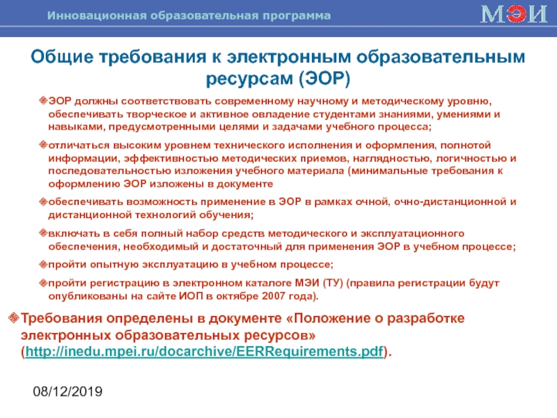 Требования определены в документе «Положение о разработке электронных образовательных ресурсов» (http://inedu.mpei.ru/docarchive/EERRequirements.pdf).