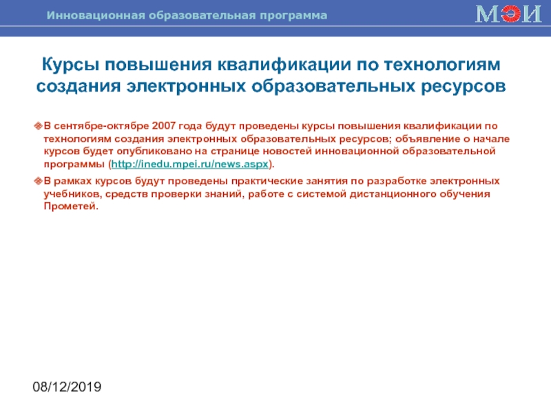 года будут проведены курсы повышения квалификации по технологиям создания электронных образовательных ресурсов; объявление о начале курсов будет опубликовано на странице новостей инновационной образовательной программы (http://inedu.mpei.ru/news.aspx).
