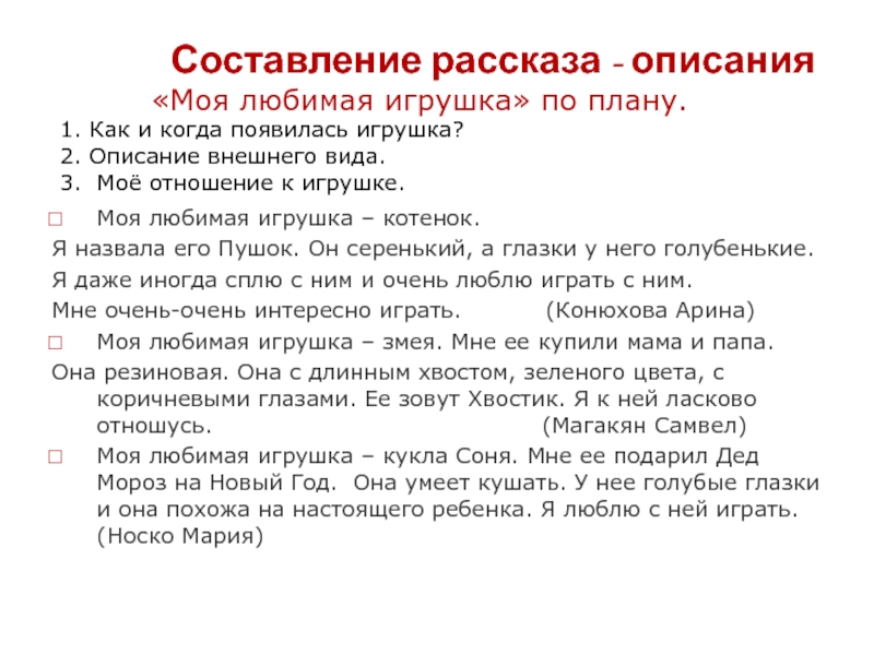 Моя любимая игрушка – кукла Соня. Мне ее подарил Дед Мороз на Новый Год. Она умеет кушать. У нее голубые глазки и она похожа на настоящего ребенка. Я люблю с ней играть. (Носко Мария)