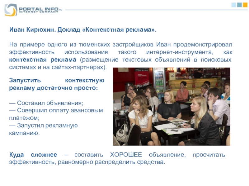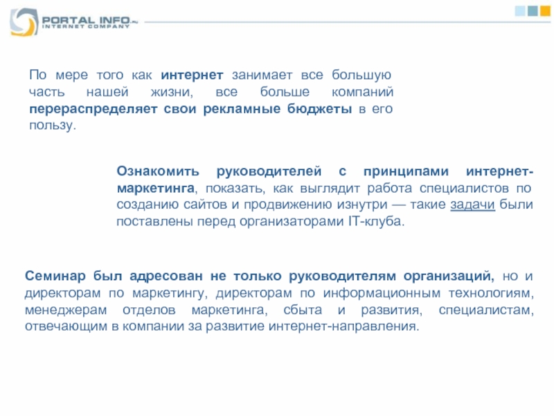 Семинар был адресован не только руководителям организаций, но и директорам по маркетингу, директорам по информационным технологиям, менеджерам отделов маркетинга, сбыта и развития, специалистам, отвечающим в компании за развитие интернет-направления.