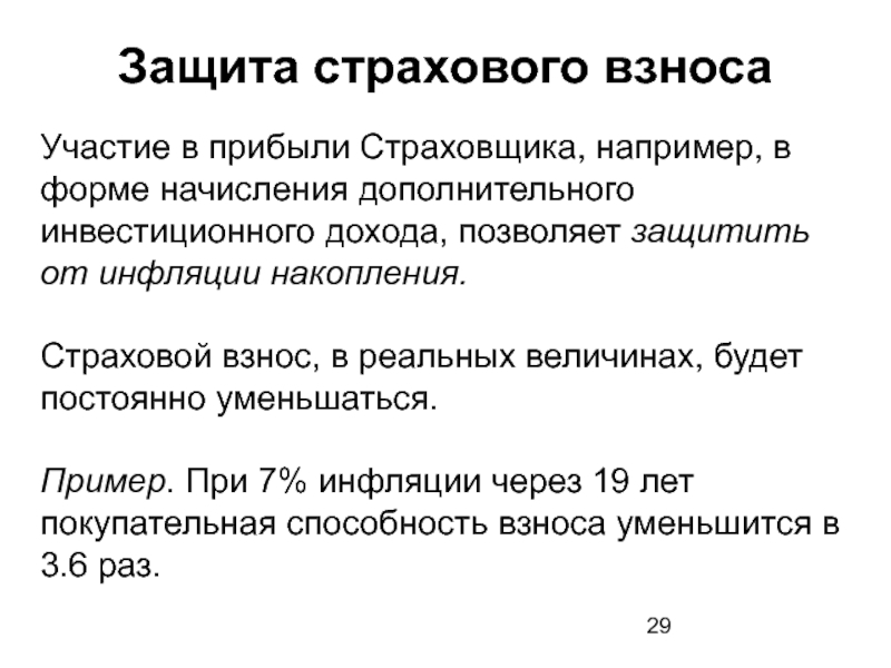 Пример. Если на день заключения договора, не зависящие от размера взноса издержки составляли 3% от взноса, то при 7% уровне инфляции через 20 лет они составят почти 12% от взноса.