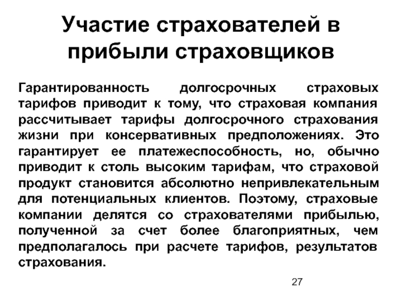 тому, что страховая компания рассчитывает тарифы долгосрочного страхования жизни при консервативных предположениях. Это гарантирует ее платежеспособность, но, обычно приводит к столь высоким тарифам, что страховой продукт становится абсолютно непривлекательным для потенциальных клиентов. Поэтому, страховые компании делятся со страхователями прибылью, полученной за счет более благоприятных, чем предполагалось при расчете тарифов, результатов страхования.
