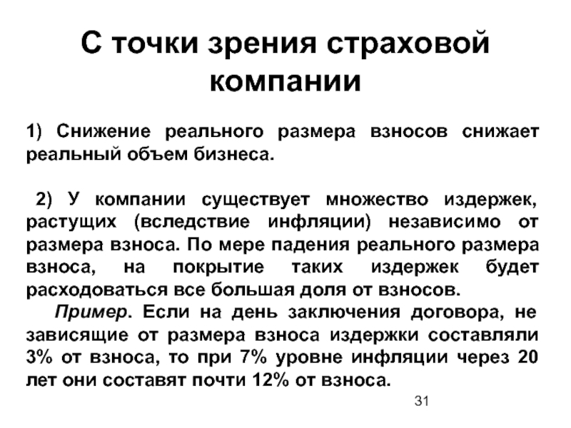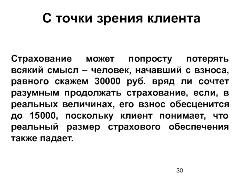 человек, начавший с взноса, равного скажем 30000 руб. вряд ли сочтет разумным продолжать страхование, если, в реальных величинах, его взнос обесценится до 15000, поскольку клиент понимает, что реальный размер страхового обеспечения также падает.