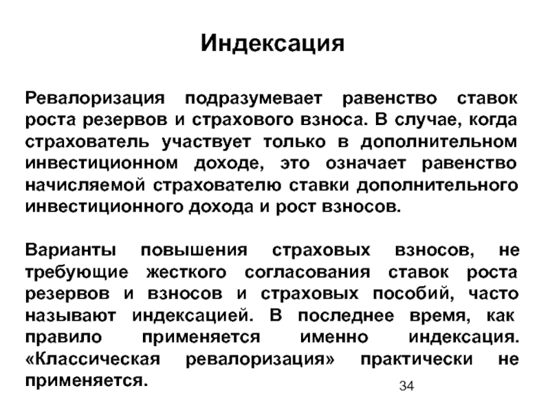 Варианты повышения страховых взносов, не требующие жесткого согласования ставок роста резервов и взносов и страховых пособий, часто называют индексацией. В последнее время, как правило применяется именно индексация. «Классическая ревалоризация» практически не применяется.