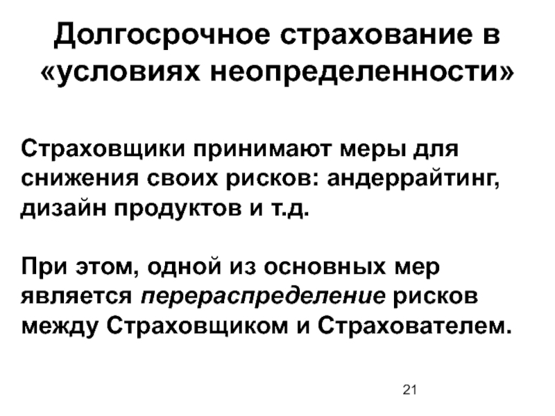 Слайд 21Долгосрочное страхование в «условиях неопределенности»