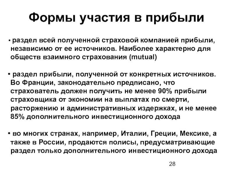 раздел прибыли, полученной от конкретных источников. Во Франции, законодательно предписано, что страхователь должен получить не менее 90% прибыли страховщика от экономии на выплатах по смерти, расторжению и административных издержках, и не менее 85% дополнительного инвестиционного дохода