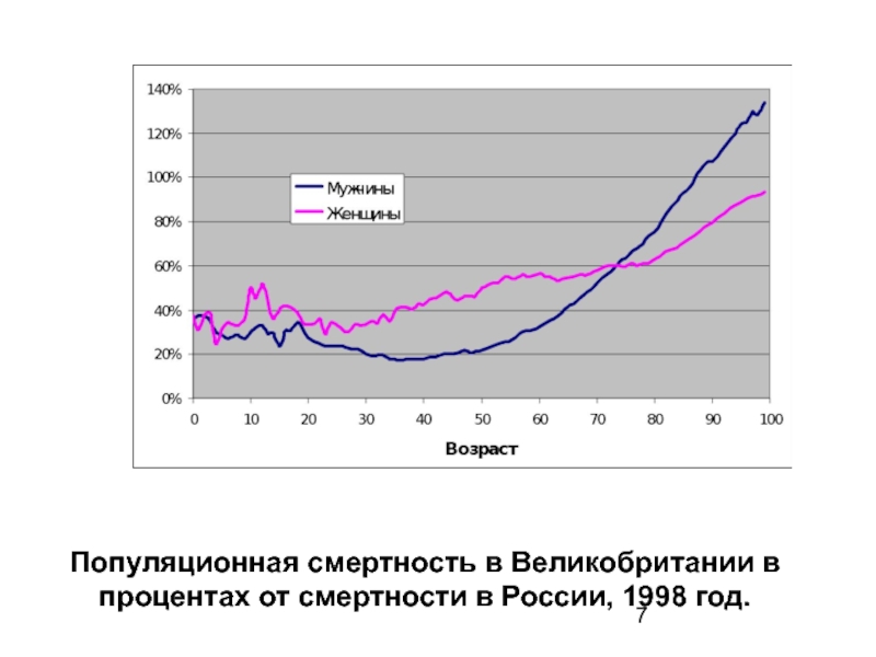 Популяционная смертность в Великобритании в процентах от смертности в России, 1998