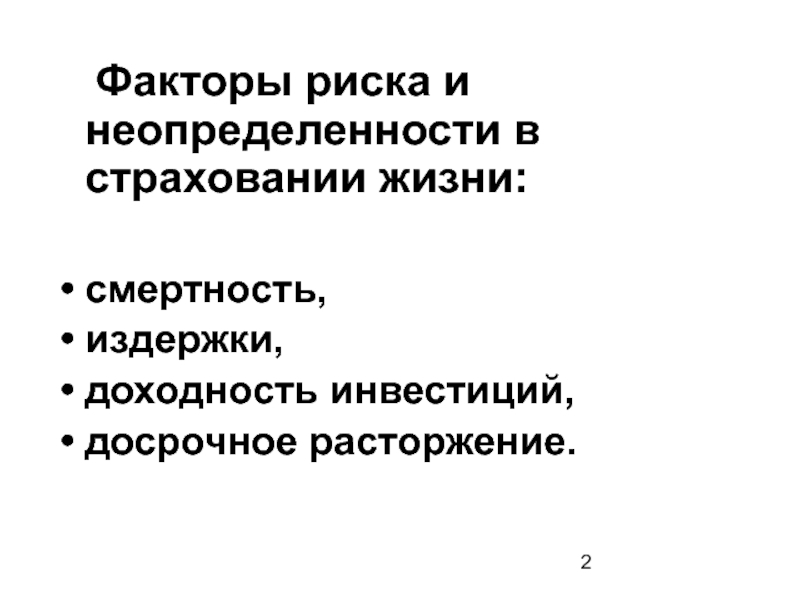 Слайд 2 Факторы риска и неопределенности в страховании жизни: