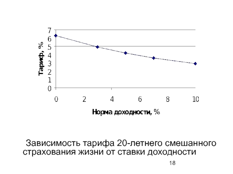 Слайд 18 Зависимость тарифа 20-летнего смешанного страхования жизни от ставки доходности