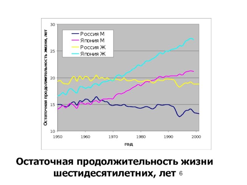 Слайд 6Остаточная продолжительность жизни шестидесятилетних, лет