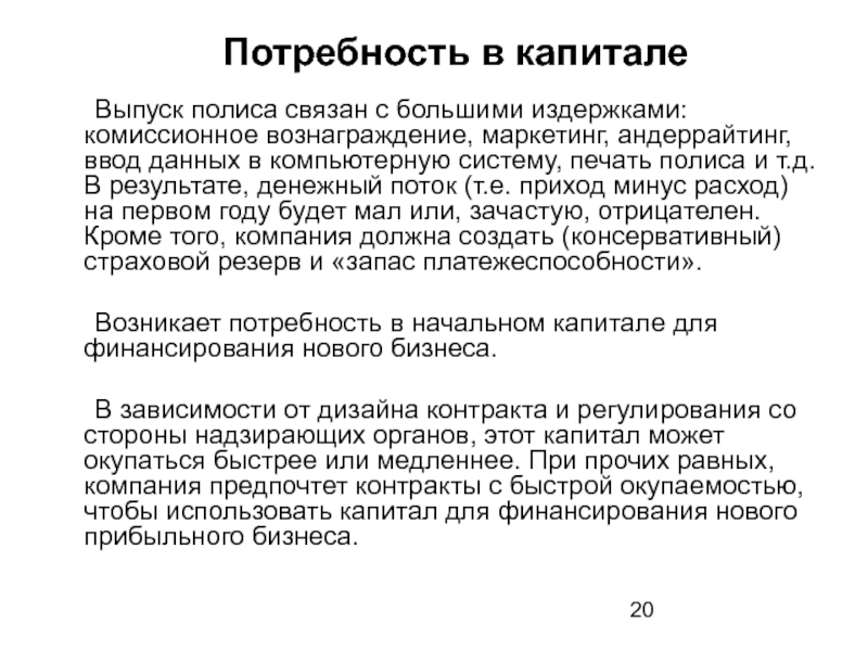 андеррайтинг, ввод данных в компьютерную систему, печать полиса и т.д. В результате, денежный поток (т.е. приход минус расход) на первом году будет мал или, зачастую, отрицателен. Кроме того, компания должна создать (консервативный) страховой резерв и «запас платежеспособности».