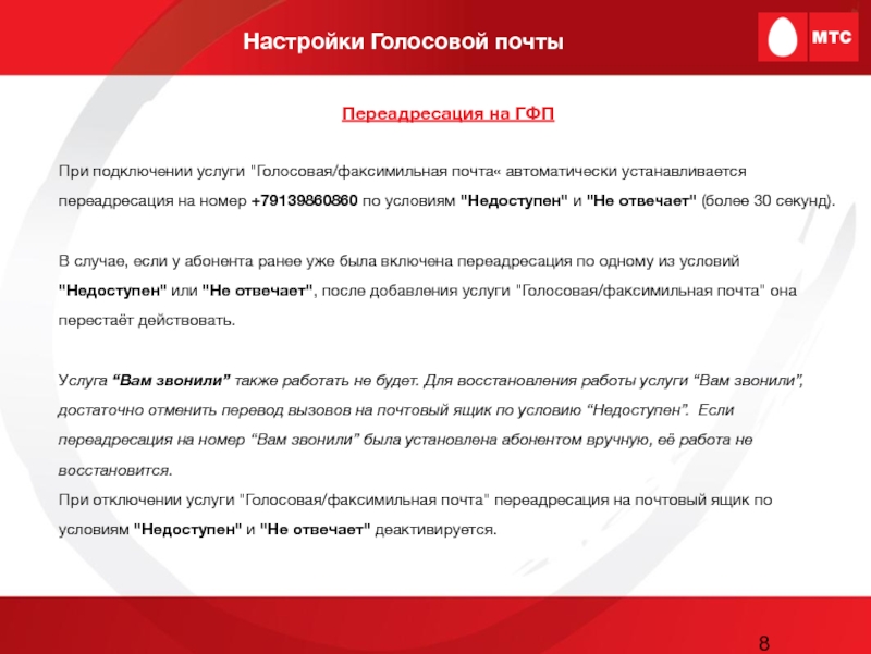 Возможность записать приветствие и прослушивать оставленные Вам сообщения