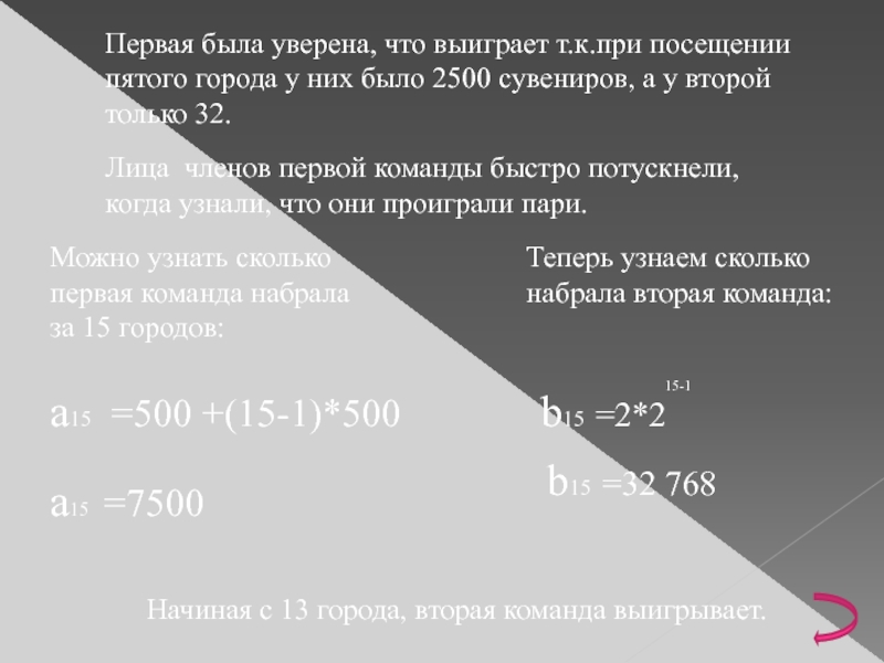 Начиная с 13 города, вторая команда выигрывает.