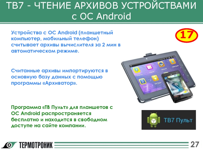 Устройства с ОС Android (планшетный компьютер, мобильный телефон) считывает архивы вычислителя за 2 мин в автоматическом режиме.