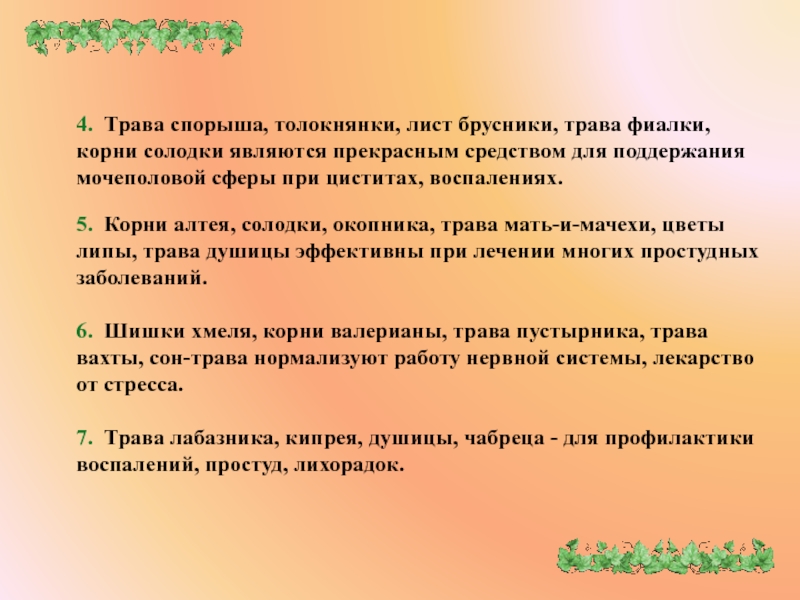 4. Трава спорыша, толокнянки, лист брусники, трава фиалки, корни солодки являются прекрасным средством для поддержания мочеполовой сферы при циститах, воспалениях.