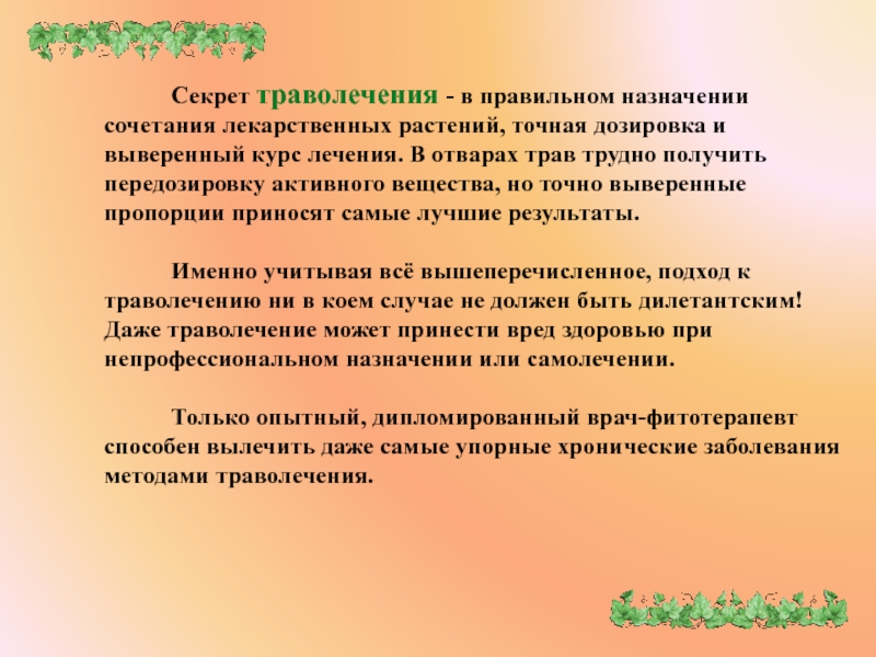 Слайд 14 Секрет траволечения - в правильном