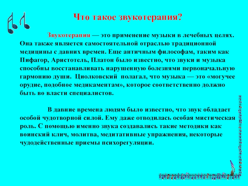 — это применение музыки в лечебных целях. Она также является самостоятельной отраслью традиционной медицины с давних времен. Еще античным философам, таким как Пифагор, Аристотель, Платон было известно, что звуки и музыка способны восстанавливать нарушенную болезнями первоначальную гармонию души. Циолковский полагал, что музыка — это «могучее орудие, подобное медикаментам», которое соответственно должно быть во власти специалистов.