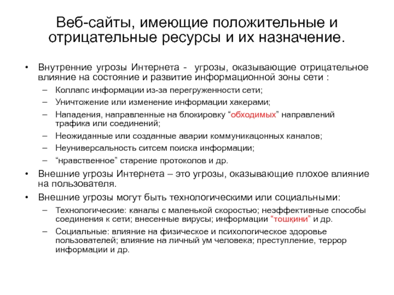 Слайд 16Веб-сайты, имеющие положительные и отрицательные ресурсы и их назначение.