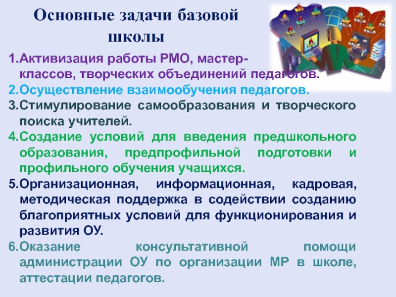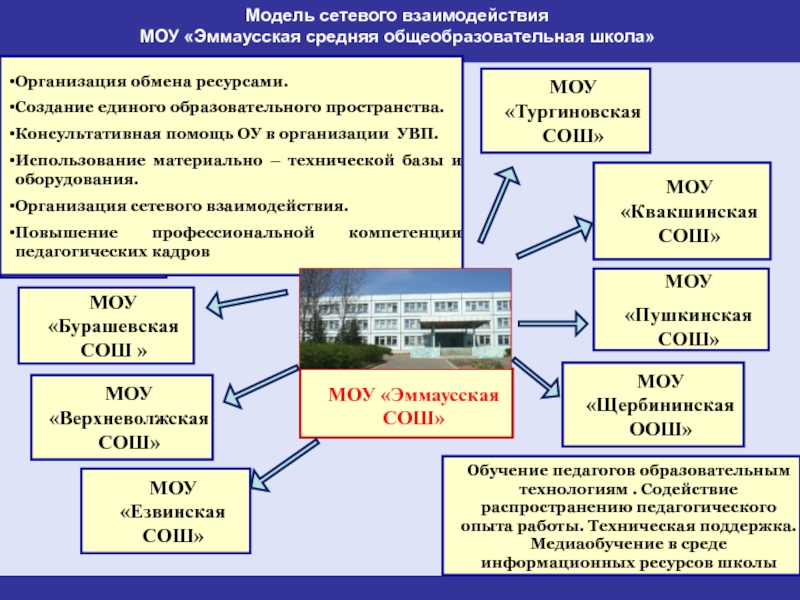 Обучение педагогов образовательным технологиям . Содействие распространению педагогического опыта работы. Техническая поддержка. Медиаобучение в среде информационных ресурсов школы
