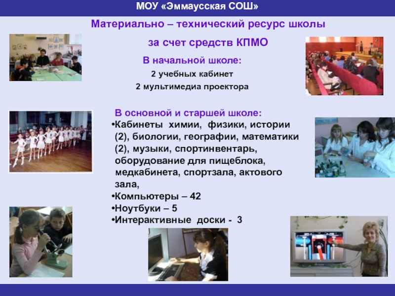 Кабинеты химии, физики, истории (2), биологии, географии, математики (2), музыки, спортинвентарь, оборудование для пищеблока, медкабинета, спортзала, актового зала,