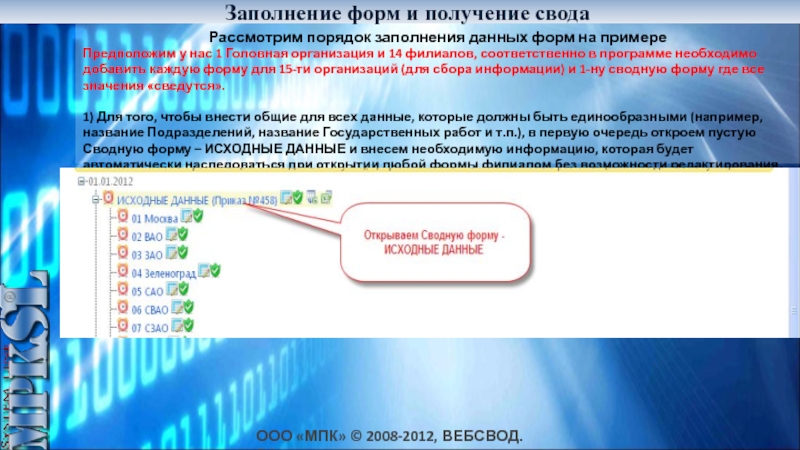 Сведение(консолидация) данных всей подведомственной сети происходит автоматически при открытии сводной формы отчета.