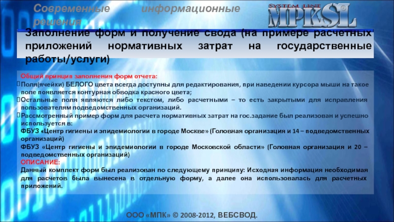 Программный продукт «MPKSL-Сводная аналитическая web-отчётность» был разработан по заказу ФБУЗ «Центр гигиены и эпидемиологии в городе Москве» и ФБУЗ «Центр гигиены и эпидемиологии в Московской области».