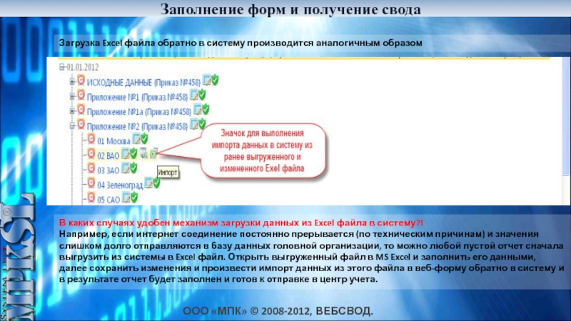 Например, если интернет соединение постоянно прерывается (по техническим причинам) и значения слишком долго отправляются в базу данных головной организации, то можно любой пустой отчет сначала выгрузить из системы в Excel файл. Открыть выгруженный файл в MS Excel и заполнить его данными, далее сохранить изменения и произвести импорт данных из этого файла в веб-форму обратно в систему и в результате отчет будет заполнен и готов к отправке в центр учета.
