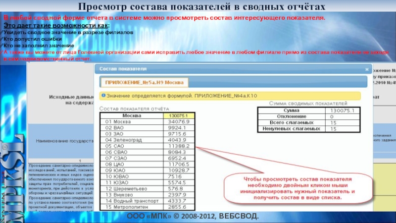 Возможность просматривать в сводных отчетах состав любого значения, а также редактировать любое значение прямо из состава показателей, не заходя в отчет подведомственной организации