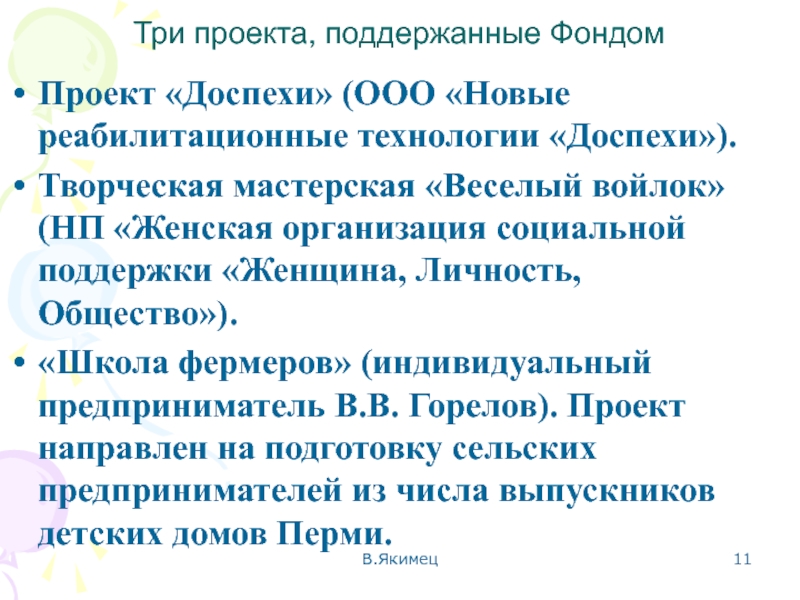 Слайд 11Три проекта, поддержанные Фондом