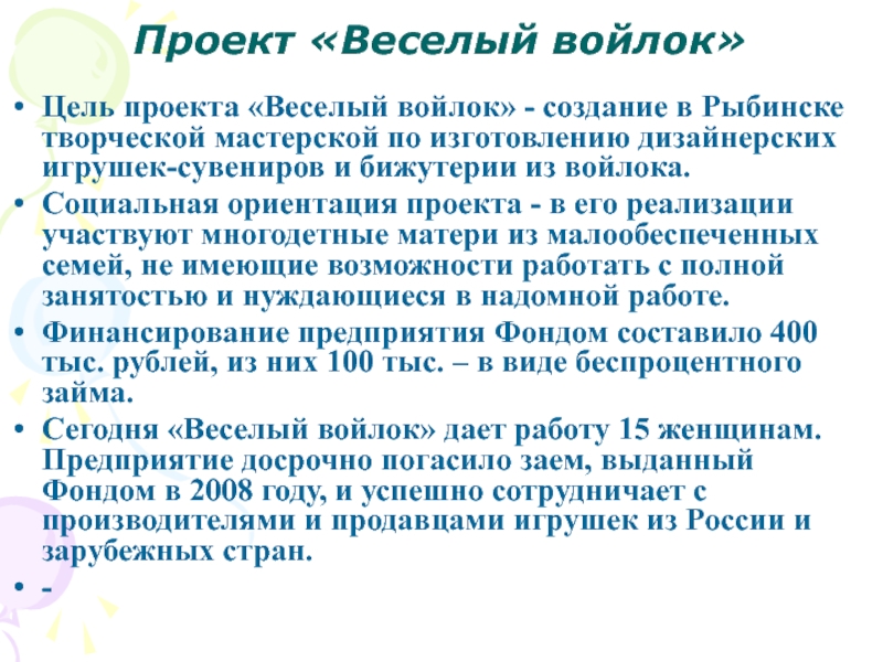 Цель проекта «Веселый войлок» - создание в Рыбинске