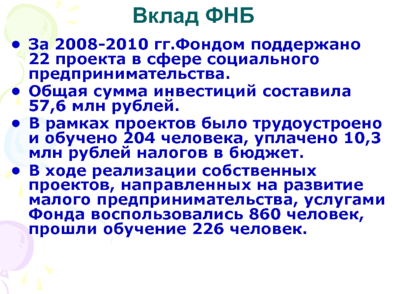 Общий объем инвестиций составил 9,5 млн рублей, из них 5,5 млн – в форме беспроцентного займа. Фонду возвращены 50% инвестированных средств.