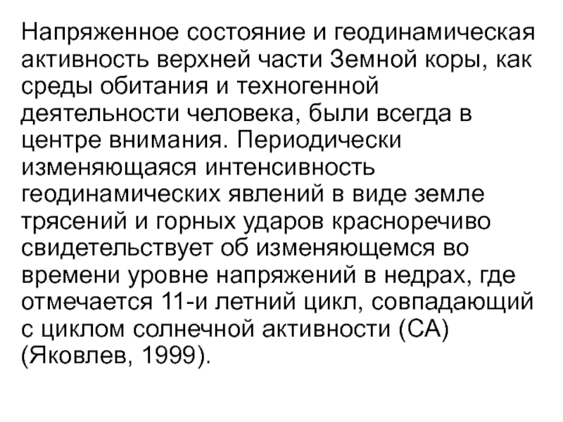 обитания и техногенной деятельности человека, были всегда в центре внимания. Периодически изменяющаяся интенсивность геодинамических явлений в виде землетрясений и горных ударов красноречиво свидетельствует об изменяющемся во времени уровне напряжений в недрах, где отмечается 11-и летний цикл, совпадающий с циклом солнечной активности (СА) (Яковлев, 1999).