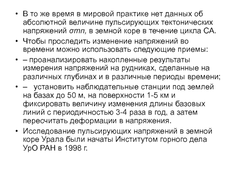 Исследование пульсирующих напряжений в земной коре Урала были начаты Институтом горного дела УрО РАН в 1998 г.