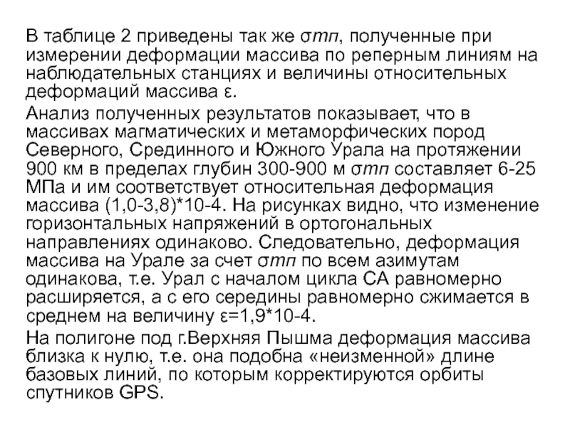 На полигоне под г.Верхняя Пышма деформация массива близка к нулю, т.е. она подобна «неизменной» длине базовых линий, по которым корректируются орбиты спутников GPS.
