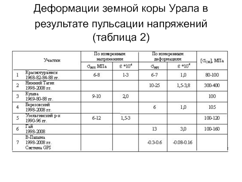 Слайд 12Деформации земной коры Урала в результате пульсации напряжений (таблица 2)
