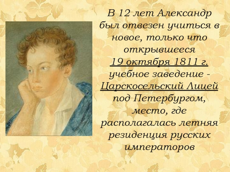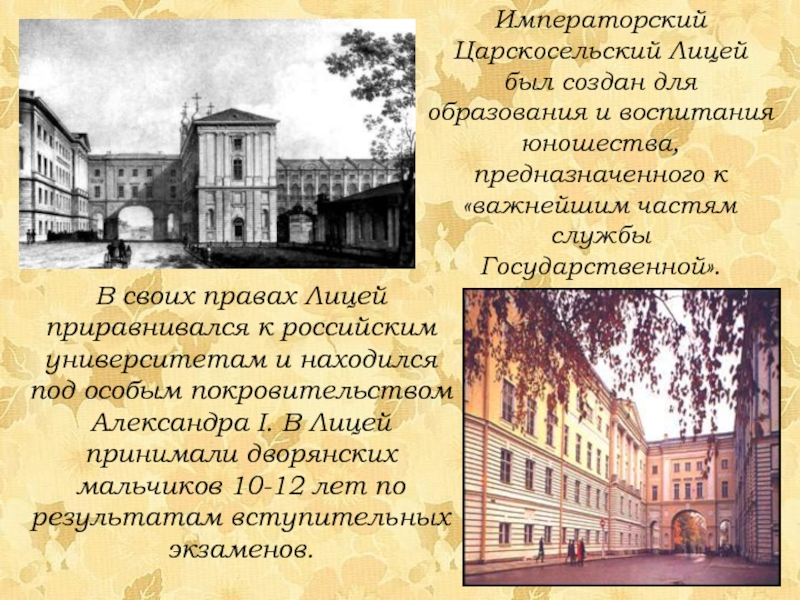 В своих правах Лицей приравнивался к российским университетам и находился под особым покровительством Александра I. В Лицей принимали дворянских мальчиков 10-12 лет по результатам вступительных экзаменов.