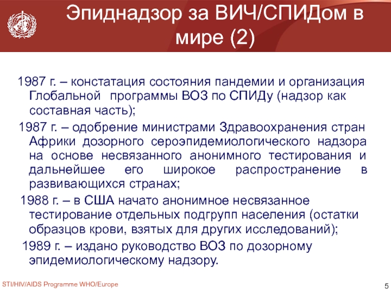 г. – констатация состояния пандемии и организация Глобальной программы ВОЗ по СПИДу (надзор как составная часть);