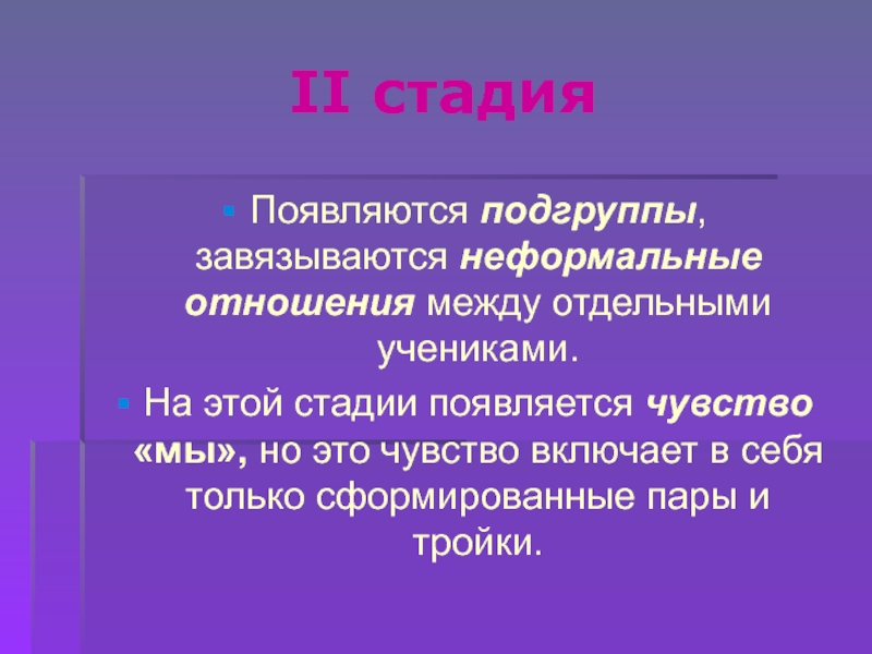 стадии появляется чувство «мы», но это чувство включает в себя только сформированные пары и тройки.