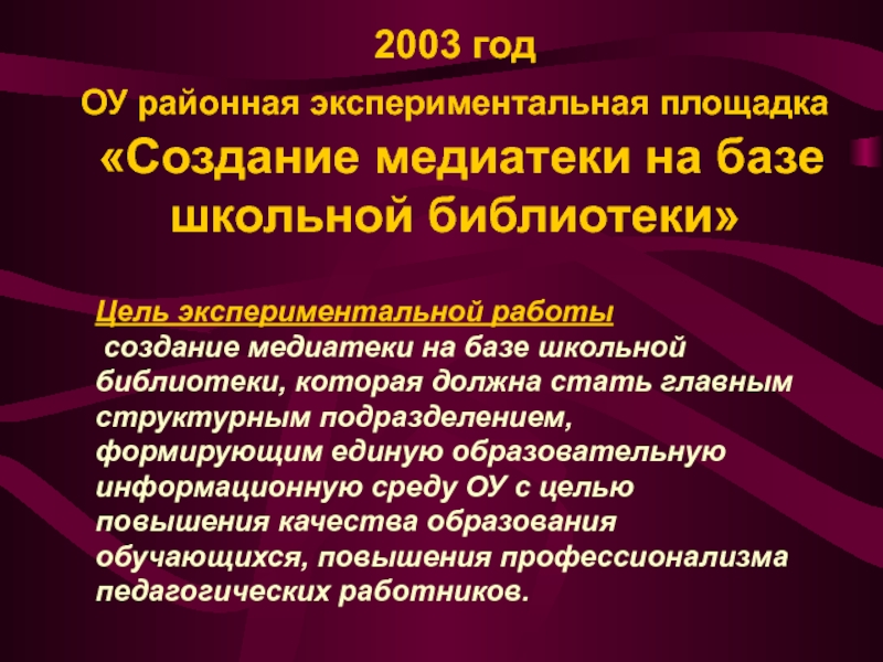 создание медиатеки на базе школьной библиотеки, которая должна стать главным структурным подразделением, формирующим единую образовательную информационную среду ОУ с целью повышения качества образования обучающихся, повышения профессионализма педагогических работников.