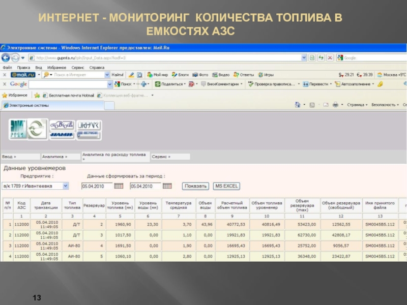 Данные о количестве топлива в емкостях нефтехранилищ