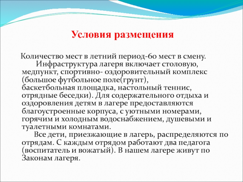 баскетбольная площадка, настольный теннис, отрядные беседки). Для содержательного отдыха и оздоровления детям в лагере предоставляются благоустроенные корпуса, с уютными номерами, горячим и холодным водоснабжением, душевыми и туалетными комнатами.