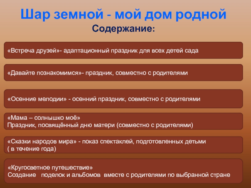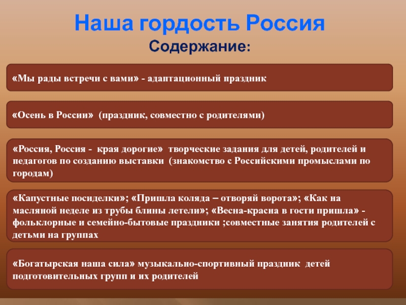 «Капустные посиделки»; «Пришла коляда – отворяй ворота»; «Как на масляной неделе из трубы блины летели»; «Весна-красна в гости пришла» - фольклорные и семейно-бытовые праздники ;совместные занятия родителей с детьми на группах