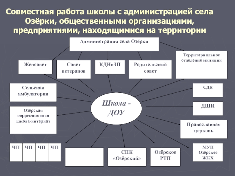 Слайд 2Совместная работа школы с администрацией села Озёрки, общественными организациями, предприятиями, находящимися