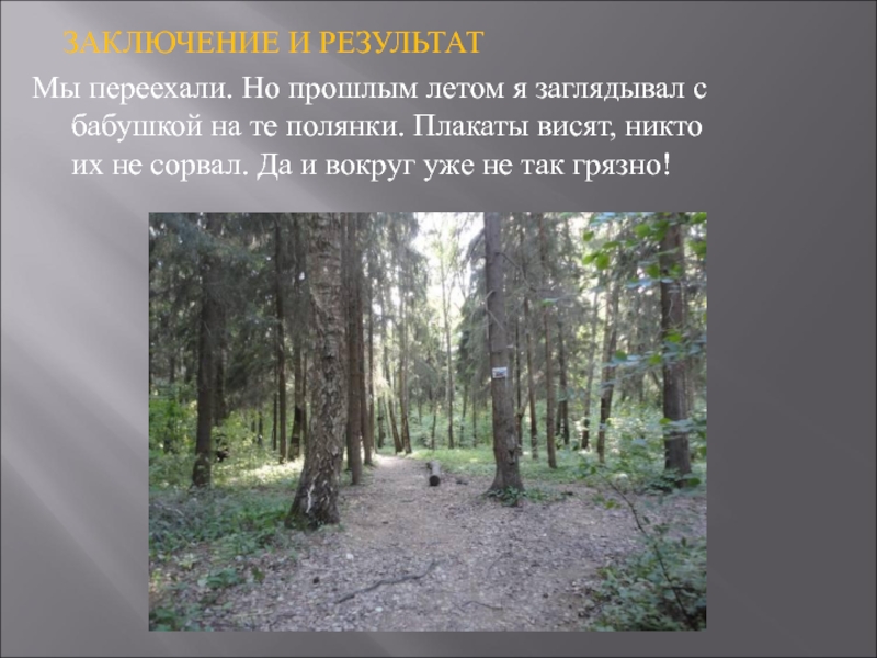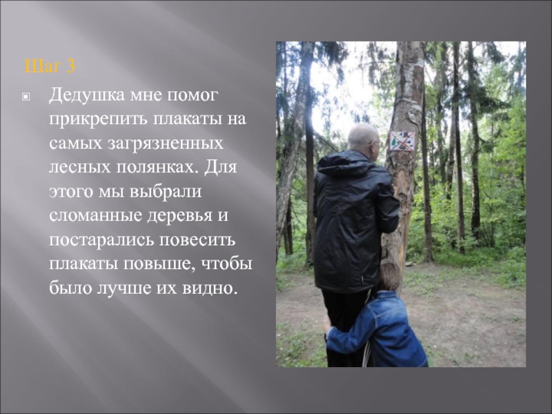 Дедушка мне помог прикрепить плакаты на самых загрязненных лесных полянках.