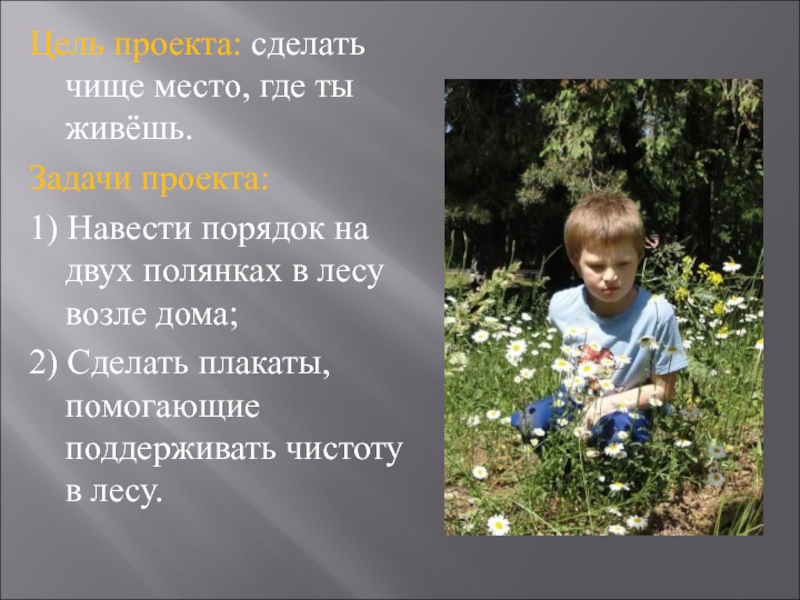 Слайд 2Цель проекта: сделать чище место, где ты живёшь.